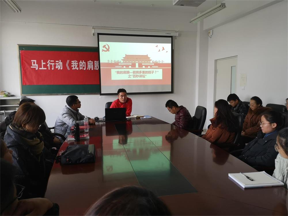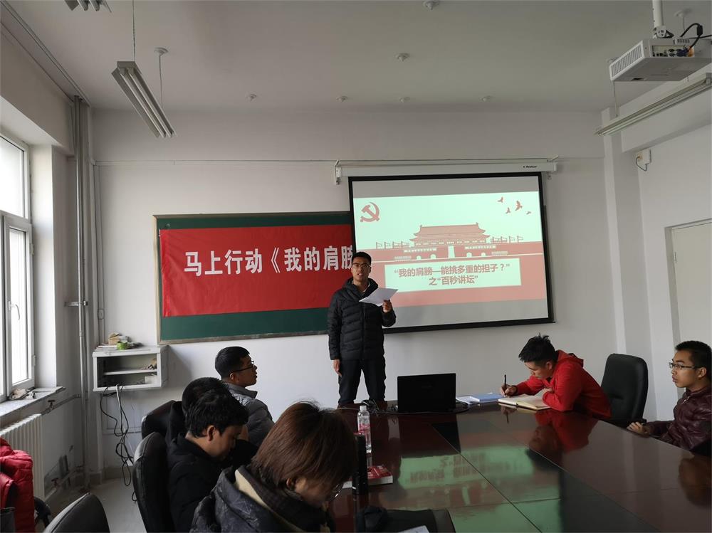 为响应在全校组织开展的“我的肩膀—能挑多重的担子?”主题讨论及实践活动,开元官网于2018年11月20日中午在盛乐校区学院楼B216举办“百秒讲坛”活动。团总支副书记范晓刚老师及研一、研二全体研究生参加了本次活动。