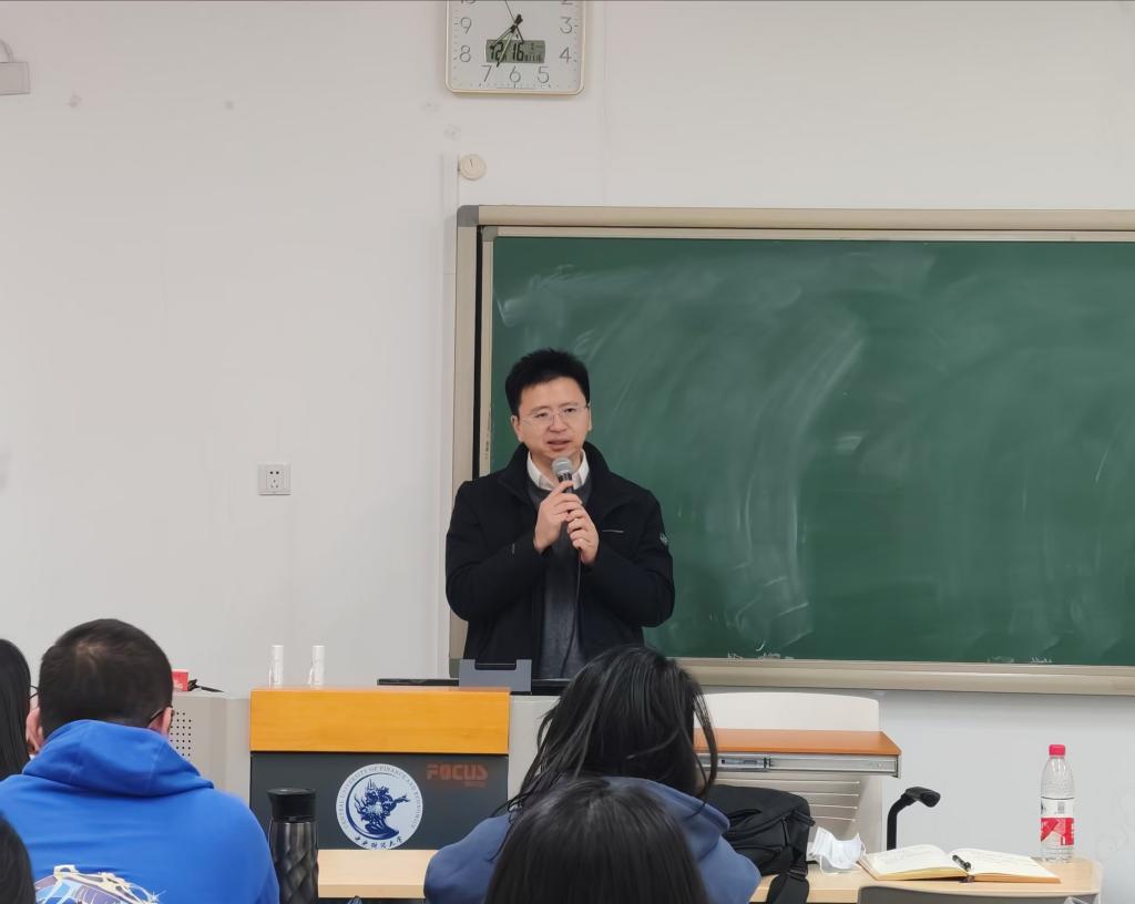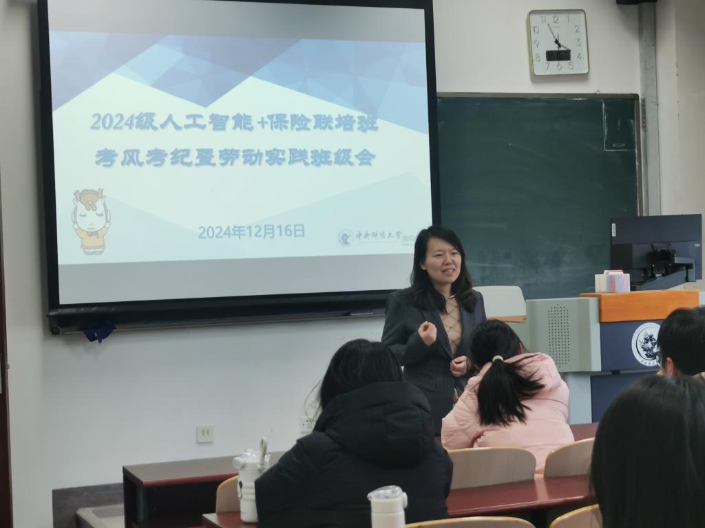 最后,周桦院长为同学们介绍了“人工智能+保险”联培项目的由来与愿景。周桦院长提到,“人工智能+保险”代表了保险行业的未来趋势,学院致力于培养能够适应这一未来变革的精英人才。联培项目不仅为同学们提供了跨校学习的宝贵机会,也意味着同学们要勇于面对新环境的挑战。最后,周桦院长向同学们表达了美好的祝愿,表示学院将始终倾听同学们的声音,全力支持并帮助同学们解决在学习及日常生活中遇到的各种困难,并勉励同学们在即将到来的期末考试中展现出最佳状态,考出风采、考出风格、考出优异成绩。