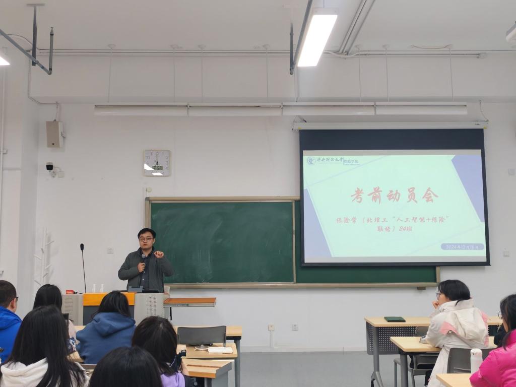 随着期末的临近,为了充分调动保险学(北理工“人工智能+保险”联培)24班同学们的学习积极性,充分了解劳动实践周的活动安排,新葡萄8883官网AMG官网于12月16日举行了考前动员会暨劳动实践启动会。此次会议旨在鼓励同学们全身心投入复习备考,积极参与劳动实践,同时再次深入介绍联培项目,针对性地解答同学们关于该项目的疑问。本次活动由班主任王吉元老师主持,新葡萄8883官网AMG官网院长周桦、副院长王丽珍、保险系系主任马冰、2024级本科生辅导员张玲及保险联培24班全体同学共同参与。