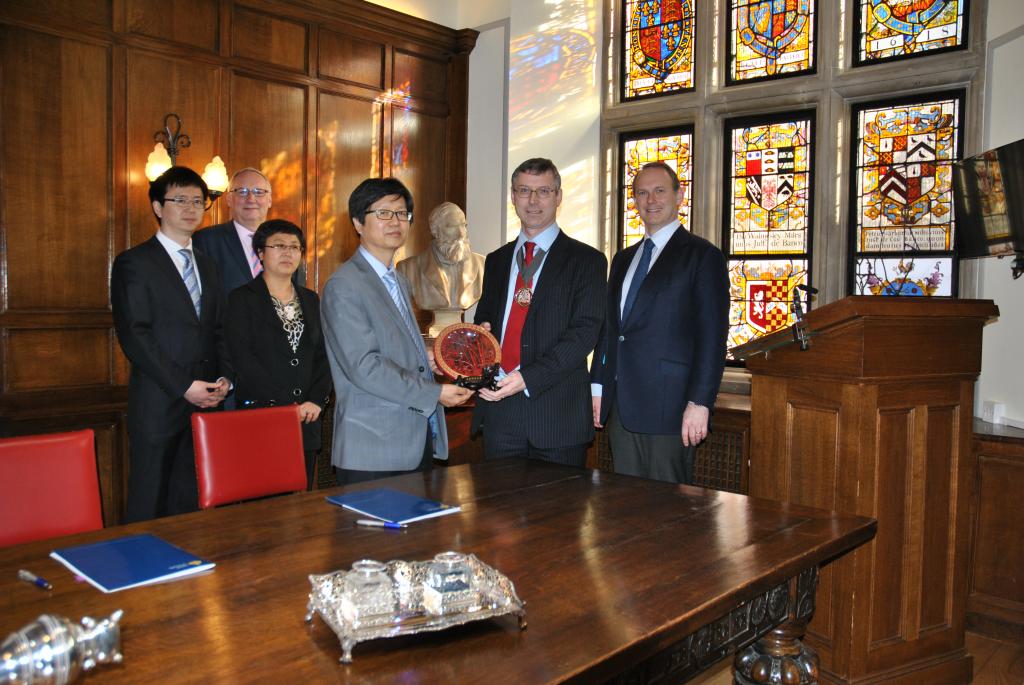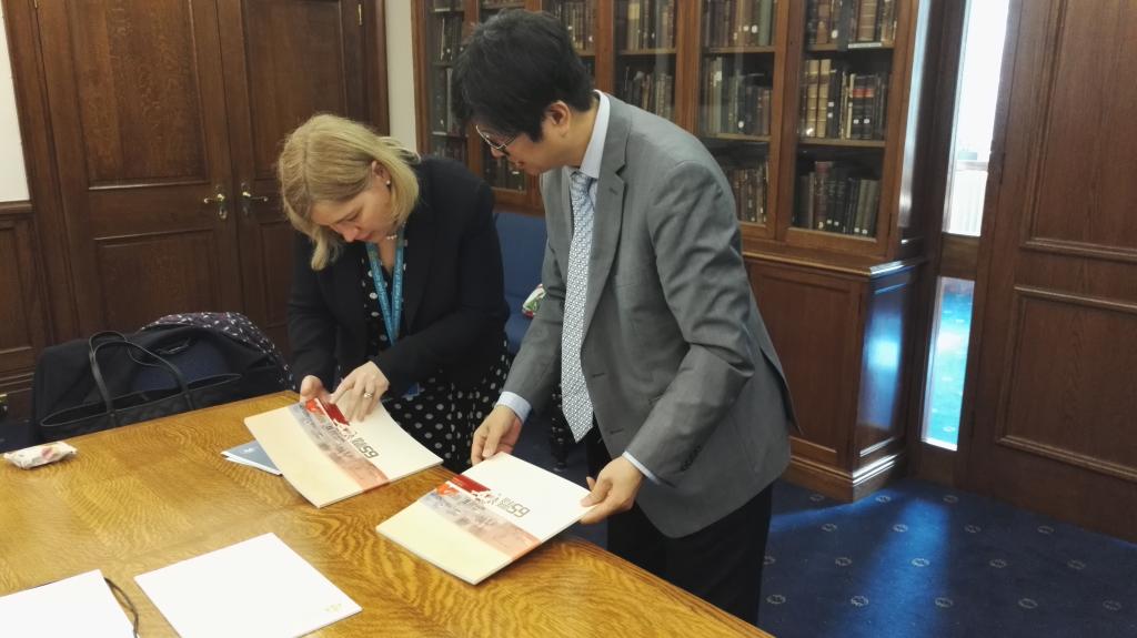 午餐后,在英精协会主席ColinWilson及首席执行官DericCribb的引领下,一行人参观了具有近二百年悠久历史的英国精算师协会所在地StapleInn。协会陈列的历史资料,包括:最早生命表的出版物、协会早期考试试题的手迹材料、以及新葡萄8883官网AMG官网20多年前赠送的纪念品“编钟模型”,这些珍品给了一行人极深的印象。丰富的资料表明了精算职业、精算教育及精算职业资格考试的发展历程和协会对历史的珍视。