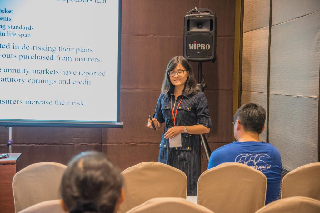 在9月21日下午举行的分会场讨论中,陈翠霞博士作了主题为“Optimal Risk-Taking and Risk Management Decisions of Annuity Insurers under Cumulative Prospect Theory”的专题报告。其将CPT理论引进年金保险业务中,通过研究变化性的风险态度最优化保险公司的决策。其演讲内容引起了与会者的广泛关注,会后参会人员纷纷提问,并就该模型展开了交流和讨论。经过交流,陈翠霞博士受益匪浅。