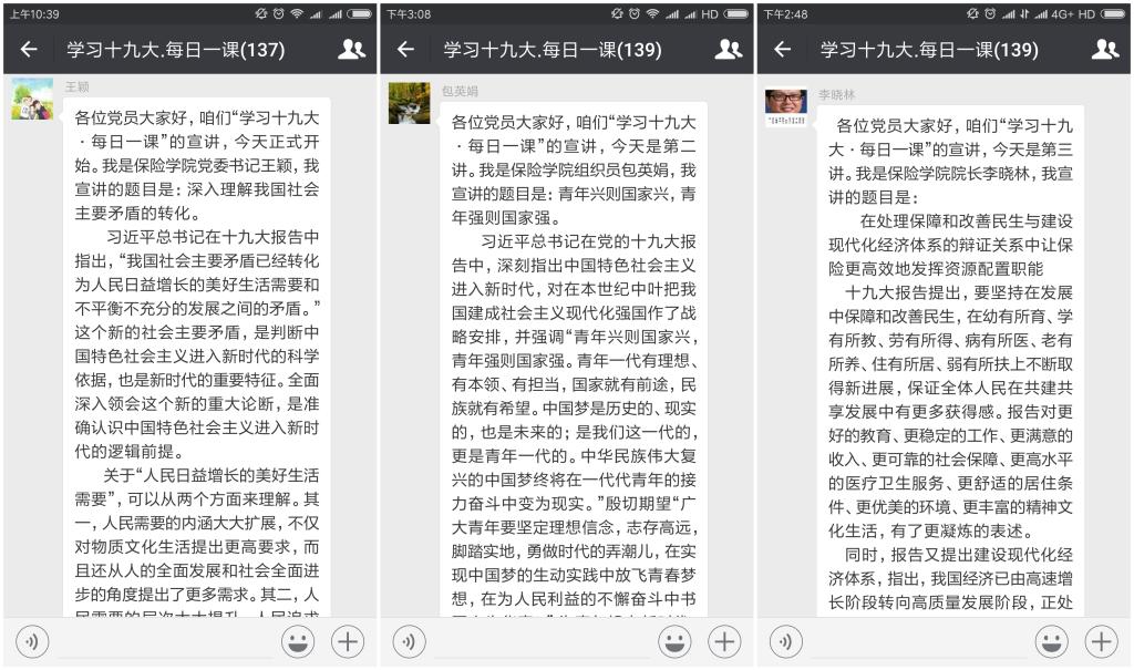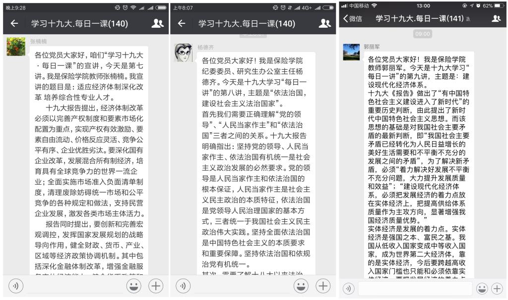 11月13日,由新葡萄8883官网AMG官网党委书记王颖开始第一次宣讲,她围绕主题“深入理解我国社会主要矛盾的转化”,从习近平总书记党的十九大报告出发,深入浅出地诠释了我国社会的主要矛盾。最后还提醒各位师生党员注意党的十九大报告中的新表述的关键词,宣讲内容丰富而精彩,微信群成员反响热烈,师生党员们积极发表自己听完宣讲后的感悟。第二场和第三场分别由新葡萄8883官网AMG官网组织员包英娟和新葡萄8883官网AMG官网院长李晓林进行宣讲,虽然他们同样是对党的十九大进行解读,但关注了不同的方面,从而带领大家从不同角度出发去学习习近平总书记党的十九大报告。宣讲后,师生党员们对党的十九大的认识更加全面也更进了一层。包英娟讲了“青年兴则国家兴,青年强则国家强”这一主题,在宣讲中,她深入剖析了习近平总书记党的十九大报告,希望青年能学习党的十九大报告,牢固树立理想信念,志存高远,脚踏实地,学好本领,勇担责任,勤于实践,善于开拓,争当先锋,把个人奋斗融入祖国前途命运和民族复兴伟大梦想。而李晓林院长则从保险角度出发,结合党的十九大报告,指出保险保障应当为幼、学、劳、病、老、住、弱七项事业发力,并在服务七项事业中发展自己,核心就是处理好七项事业与发展方式、经济结构、增长动力之间的辩证关系,以更高的效率发挥保险的资源配置职能。