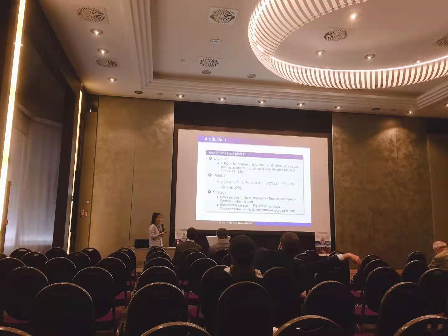 硕士生林荔圆做题为“Non-exponential Discounting Portfolio Management and insurance With Habit Formation”分会场报告。她在传统的最优消费-投资-保险问题中引入了非指数时间贴现函数和消费习惯,使原来的模型可以更好的描述个体的特征,进而运用扩展HJB方程得到了均衡的消费,投资和寿险策略,并进行了数值模拟。