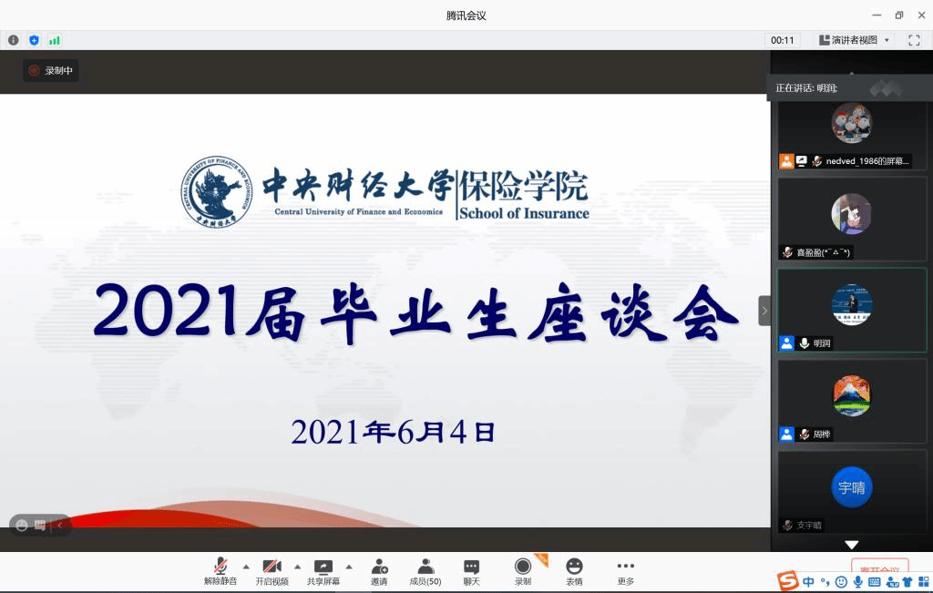 5月20日下午,学院在沙河校区西区主教403举办了研究生就业经验座谈分享会,邀请了7位2021届学长学姐为2020级学弟学妹们分享了求职与就业经验。5月30日上午,由新葡萄8883官网AMG官网2018级、2019级和2020级精算学研究生共同举办的研究生毕业生就业经验交流座谈会,通过腾讯会议的方式在线上进行。本次会议邀请到6位优秀的应届毕业生,分享了他们在暑期实习、秋招春招、学术科研等方面的经验。两次座谈会涵盖直保、再保、咨询、资管等多类公司的求职经验分享,满足了们多样丰富的需求,为大家未来求职道路指引了方向,也更加坚定了毕业生们矢志不渝、立志报国的信念!