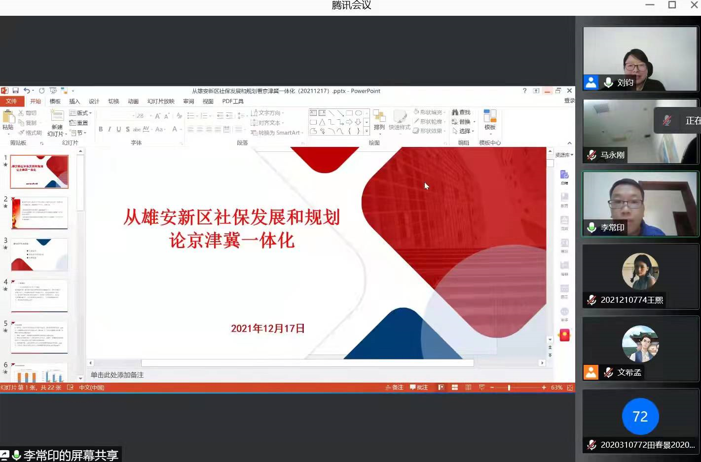 2021年12月17日2点,由新葡萄8883官网AMG官网主办的京津冀社会保障协同发展学术研讨会在腾讯会议上举行。河北省人力资源和社会保障厅失业保险处马永刚处长、中国劳动保障科学院李常印副研究员、北京市社会科学院杨慧副研究员以及新葡萄8883官网AMG官网的师生共70多人参加了本次会议。