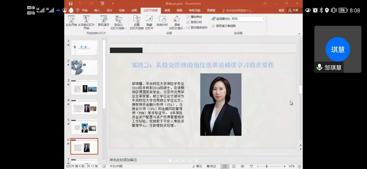 作为一名优秀的投资经理,邹琪慧学姐从投资经理的角度向大家分享了基础课学习的重要性。在她看来,在个人精力有限的情况下,仍要以学习为第一要务。同时,她也分享了了大学学习的侧重点以及考取相关证书的选择和时间建议。
