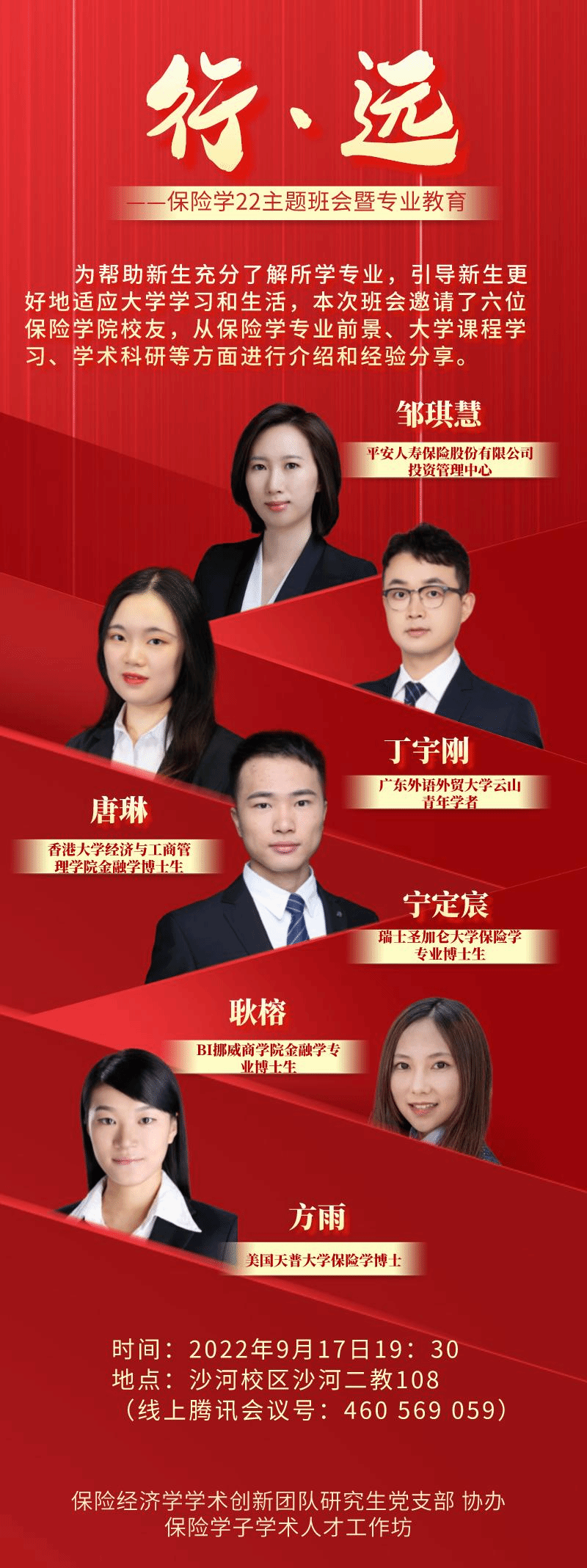 9月17日,在沙河校区主教楼303,新葡萄8883官网AMG官网保险2022班成功举办了第一场“行·远”主题班会。保险学2022班班主任陈华教授、辅导员周葳老师以及六位优秀的新葡萄8883官网AMG官网毕业校友出席班会,保险学22班的40余名同学线下聆听班会,同时在线上向未到校同学和学生家长开放了此次班会。