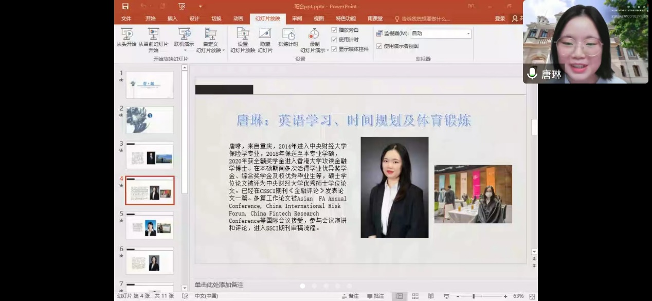 唐琳以《英语学习、时间规划及体育锻炼》为主题,进行了专题经验分享报告,她从本科英语的学习技巧,如何高效率进行时间规划,以及课后体育锻炼安排等方面和学弟学妹进行了经验分享,为今后本科学习生活提供了方向和指导。