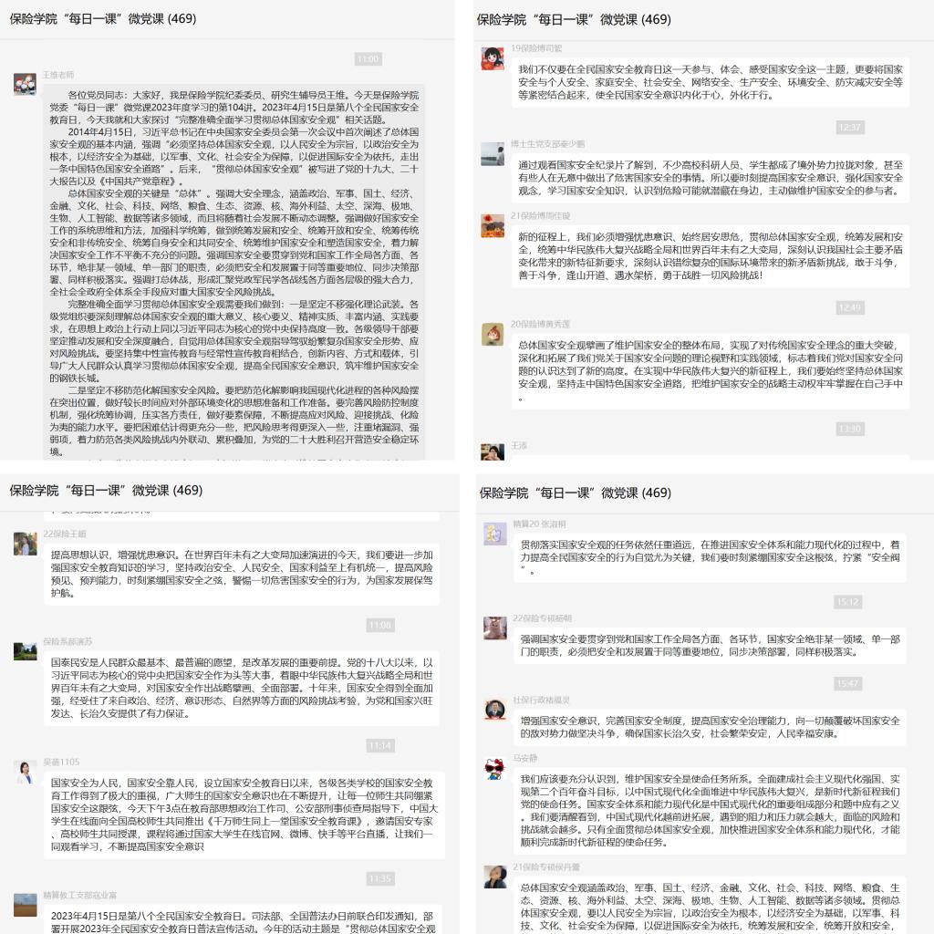 同时,为加强党员同志的国家安全意识,树牢总体国家安全观,新葡萄8883官网AMG官网党委依托“每日一课”微党课平台发表主题为“完整准确全面学习贯彻总体国家安全观”的宣讲。各党支部师生踊跃参与,从多个角度深入探讨学习总体国家安全观,纷纷表示,国家安全人人有责,每个人都应当增强国家安全意识,从小事做起,自觉维护各领域安全,为国家发展保驾护航。