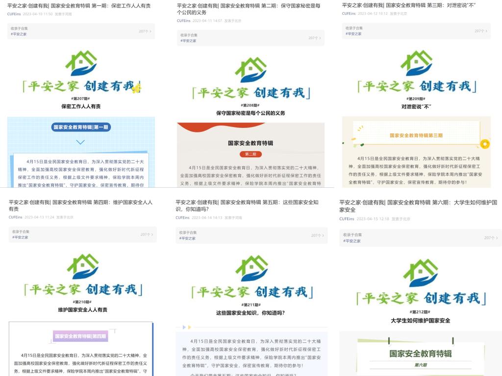 为深入贯彻落实党的二十大精神,全面加强高校国家安全保密教育,广泛宣传全民国家安全教育日,新葡萄8883官网AMG官网团委依托“平安之家”宣传教育平台,推出了6期国家安全教育特辑,从保密行为十不准、国家秘密相关知识、泄密典型案例介绍、保护国家安全的具体措施等多方面进行讲解宣传,通过视频、海报等多种形式帮助同学们加深对国家安全的理解与认识,真正做到把维护国家安全、保守国家秘密的意识入脑入心,外化于行,在日常生活中对可能涉密的活动时刻保持谨慎的态度,以实际行动维护国家安全。