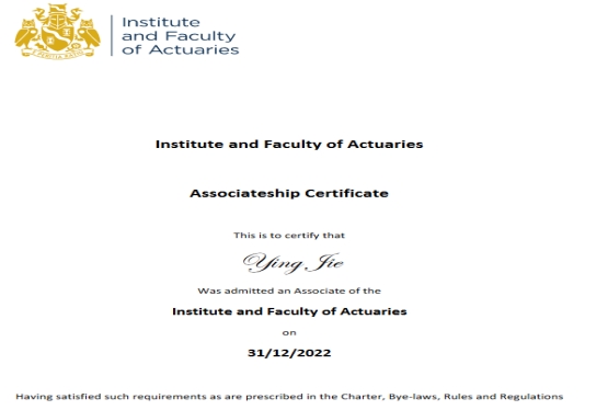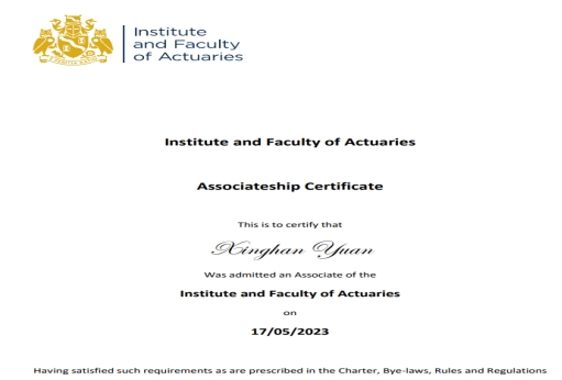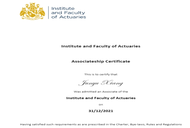 近期,英国精算师协会(IFoA)公布了2023年8月最新批次新晋精算师名单,其中闫帆、节莹和苑兴涵等3名新晋准精算师为新葡萄官网新葡萄8883官网AMG官网毕业生。另外一名2014级精算本科生向俊宇,已于2022年获得准精算师资格。以上4位准精算师资格获得者,为新葡萄官网开展英国精算师协会课程免试认证以来,可以最早获得资格认证的毕业生。