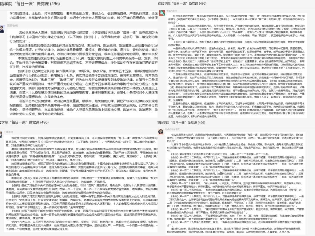 学院党委委员、团委书记吴蓓主讲《条例》第六章“对违反政治纪律行为的处分”,对违反政治纪律的行为类型做了详细说明。学院纪委委员李晨光主讲《条例》第七章“对违反组织纪律行为的处分”,强调了组织纪律的“红线”和“负面清单”内容。学院纪委委员王维主讲《条例》第八章“对违反廉洁纪律行为的处分”,强调秉公用权,不用公权谋私利。劳动与社会保障系褚福灵教授主讲《条例》第九章“对违反群众纪律行为的处分”,强调群众纪律是每名党员处理党群关系时必须遵守的行为规则,也是践行党的宗旨具体而生动的体现。