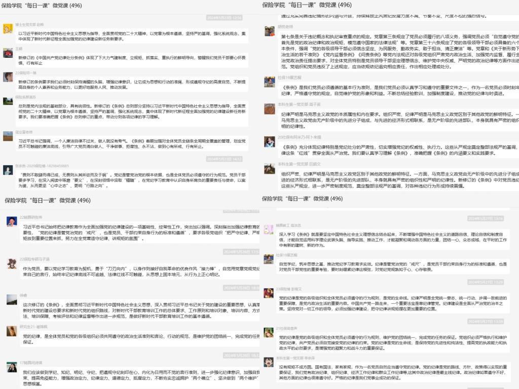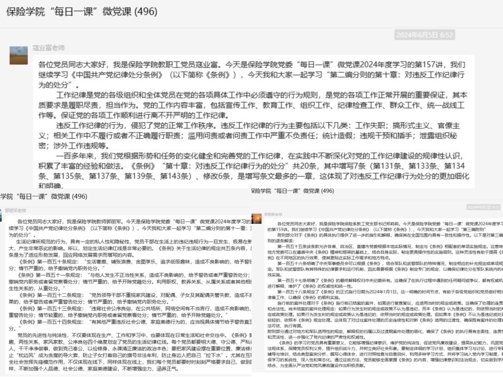 精算科学系寇业富教授主讲《条例》第十章“对违反工作纪律行为的处分”,阐述了工作失职、搞形式主义、官僚主义等几大违法工作纪律行为的处分规定。保险系郭丽军教授主讲《条例》第十一章“对违反生活纪律行为的处分”,从生活情趣、两性关系、家风家教、公序良俗四个维度强调了党员的生活纪律红线。保险系教工党支部书记郑莉莉教授主讲《条例》“第三编附则”,进一步指引和解释了《条例》的具体执行。
