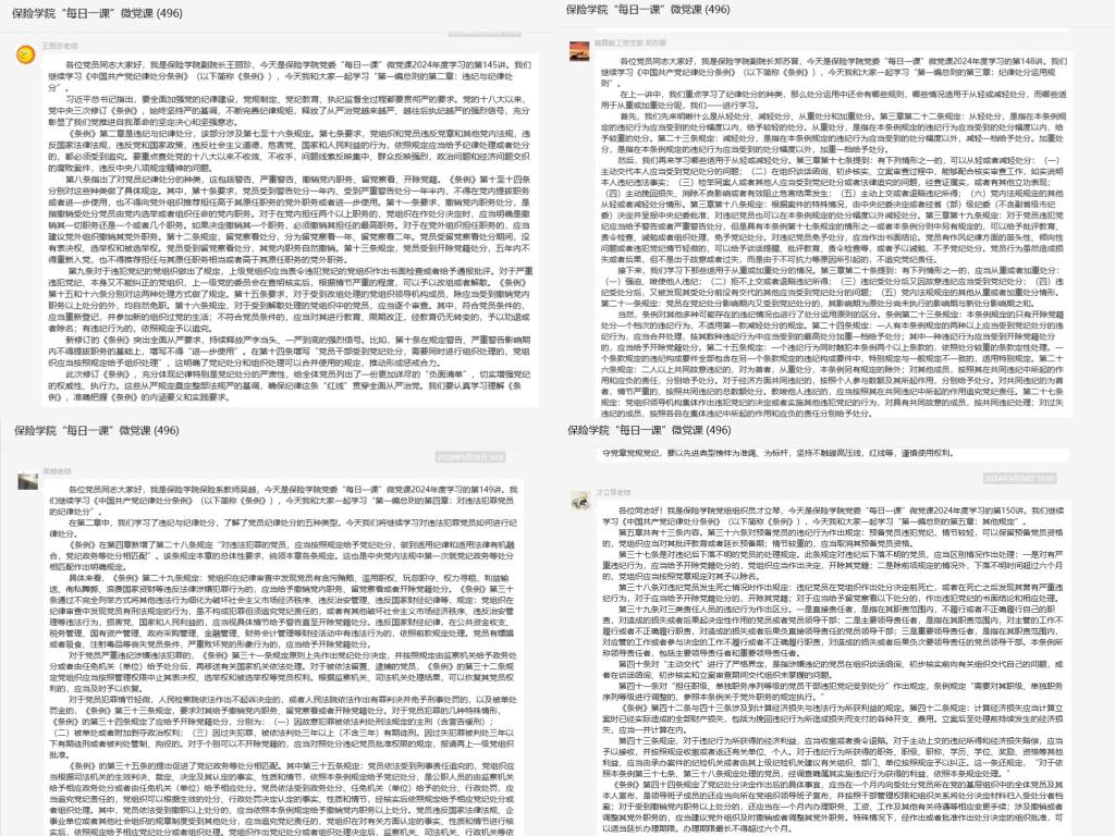 副院长王丽珍主讲《条例》第二章“违纪与纪律处分”,阐述了党员纪律处分的种类、对违犯党纪的党组织的处理规定等内容。副院长郑苏晋主讲《条例》第三章“纪律处分运用规则”,分析了适用从轻处分、减轻处分、从重处分和加重处分的情况。党委副书记吴越主讲《条例》第四章“对违法犯罪党员的纪律处分”,具体讲述了党纪政务处分相匹配等规定。组织员才立琴主讲《条例》第五章“其他规定”,对预备党员的违纪行为、违纪后下落不明的党员等情况的处分规定进行了讲解。