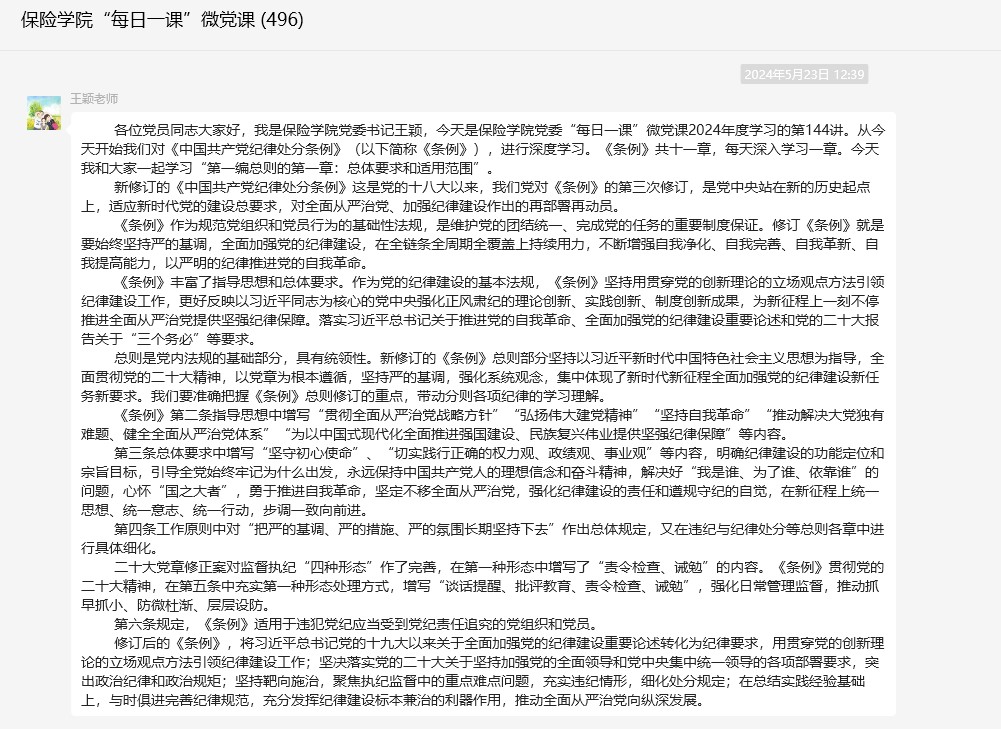 学院党委书记王颖主讲《条例》第一章,逐条讲述和分析了《条例》的指导思想和总体要求。王颖书记强调,学习《条例》是一项长期任务,必须常抓不懈,让每位党员都能成为遵规守纪的模范,为推动学院高质量发展提供坚强的纪律保障。