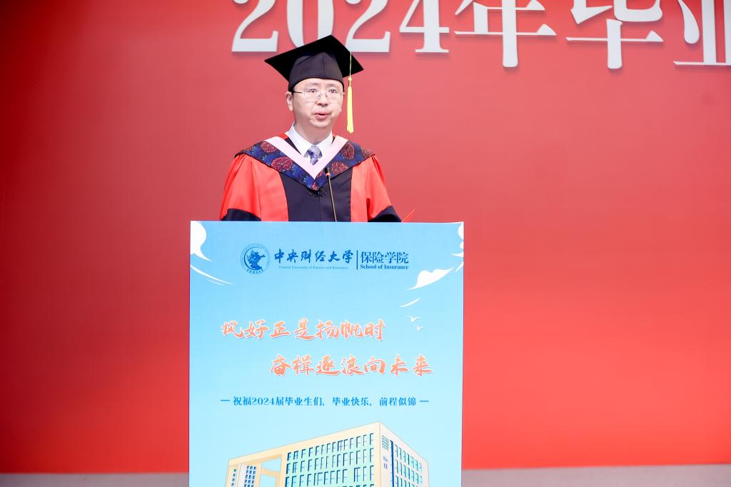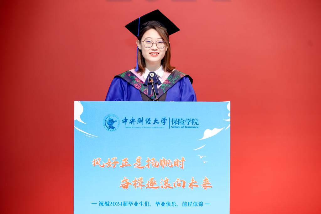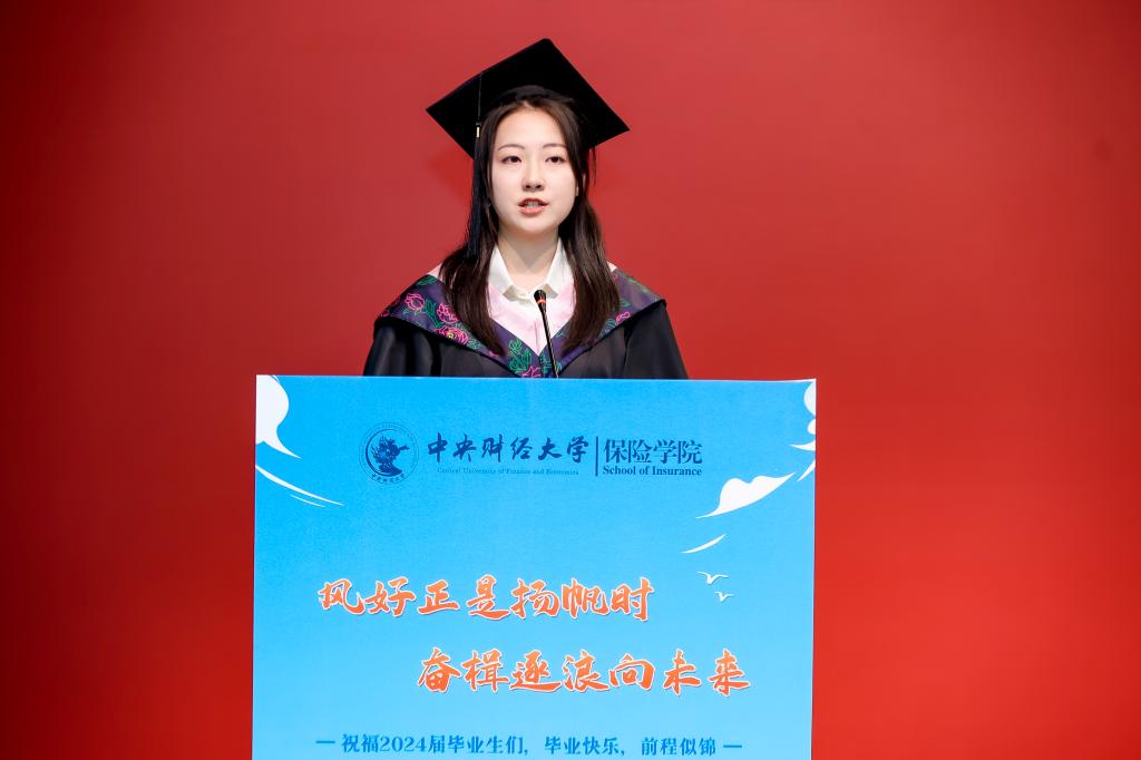 接下来,2024届硕士研究生毕业生代表杨弘琦上台发言。他回顾了自己的成长经历和学校与学院的点滴变化,表达了全体毕业生将带着所学、所感、所悟,传承温暖平和的待人之道、严谨求是的治学之风、经世济民的人生之志,未来在不同的领域中发光发热的决心。最后,他真切祝愿:“愿母校和学院蓬勃发展、再攀高峰;愿老师们身体健康、工作顺利;愿诸君如此山水,滔滔岌岌风云起。”