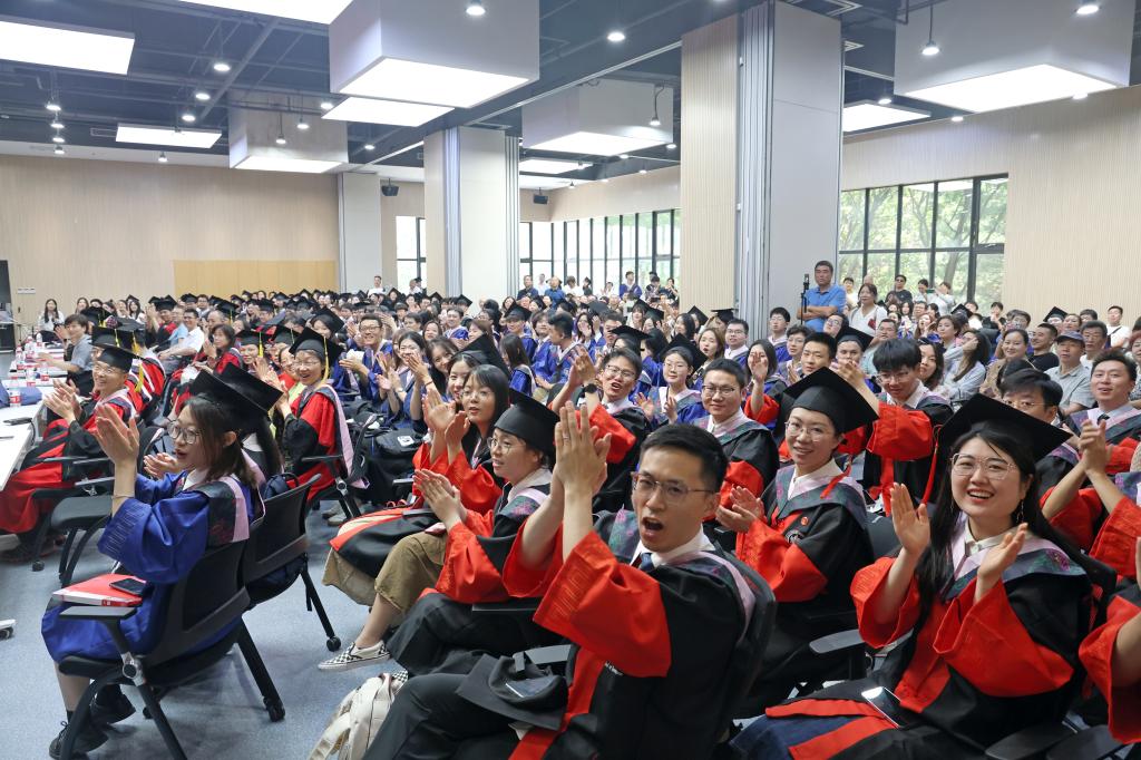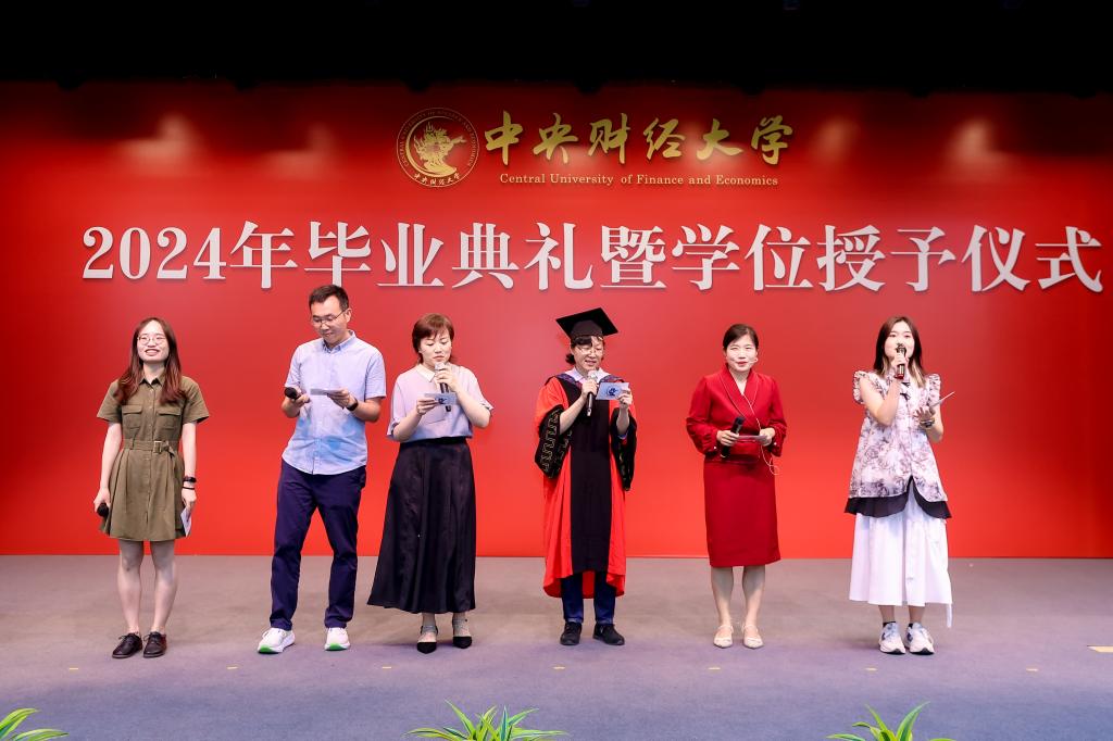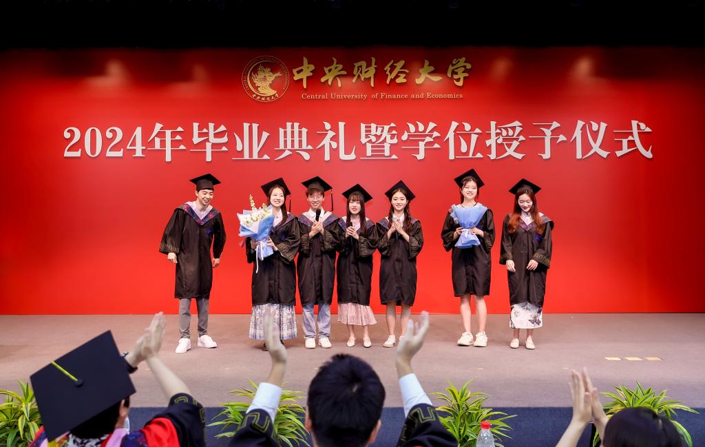 典礼伊始播放了由2024届毕业生准备的毕业视频。校园的风光、课堂的互动、活动的欢乐,毕业视频带领同学们回忆在中财大的美好时光。