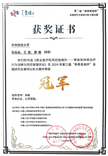 在初赛、复赛和决赛的层层挑战中,由郑敏副研究员精心指导的张淼淼、王歆、谭璇团队,凭借其项目《商业医疗险风控指南针——带病体持续治疗行为洞察与风险管理优化》,以强大的数据分析能力和对医疗险领域的深刻洞察,荣获一等奖。这是新葡萄官网首次在该竞赛中夺冠,体现了新葡萄官网在数据分析和医疗险领域的研究实力。