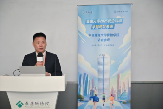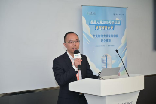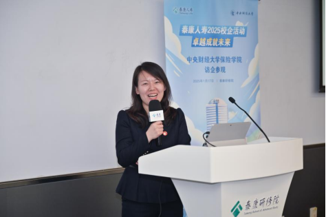 王丽珍副院长发表致辞,她首先对泰康人寿的热情接待表示感谢,然后简要介绍了学院的发展情况。她指出学院与泰康人寿已经建立就业实习基地和产教融合创新基地,目前有众多杰出校友进入泰康人寿工作。希望同学们向这些校友学习,将来能够在保险企业深耕并发展,同时在开展科学研究的过程中学习泰康的发展理念,从“率先模仿”到“自主创新”再到“开创世界性的创新商业模式”,努力使自己成为行业的拔尖创新人才。