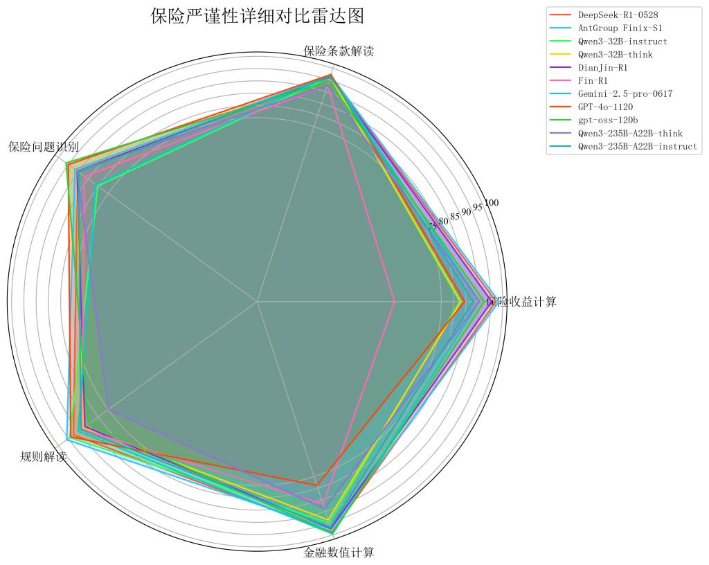 · 计算能力分化显著:收益计算、数值计算分差在20-30分之间,AntGroup Finix-S1(96.15分)在保险收益计算(98.50分)等方面排名第一