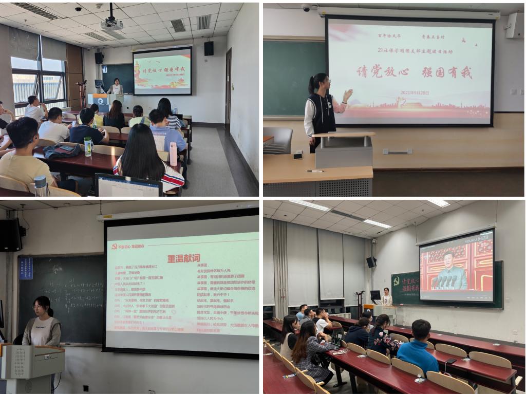 为深入学习贯彻习近平总书记“七一”重要讲话精神,加强党史理论学习,传承百年伟大信仰,新葡萄8883官网AMG官网2021级研究生新生团支部开展了“请党放心,强国有我”主题团日活动。21保险学硕团支部成员通过观看习近平总书记在庆祝大会上的讲话,知晓了我们作为新时代青年要承担的责任和使命。21精算学硕团支部的同学们通过知识竞赛、朗诵献词誓言等方式,加深了对于中国共产党党史的了解。21社保学硕团支部成员共同学习了《新时代新思想 新征程》《学而时习之——读懂新时代的100个关键词》《习近平与大学生朋友们》等书籍。在阅读分享与研讨中,大家学思感悟,理论提升,深化信仰。各支部成员纷纷表示:吾辈青年要释放青春激情,走好新时代长征路,弘扬五四精神,勇敢担当,用青春之光照亮使命之路,用青春汗水浇灌梦想之园。