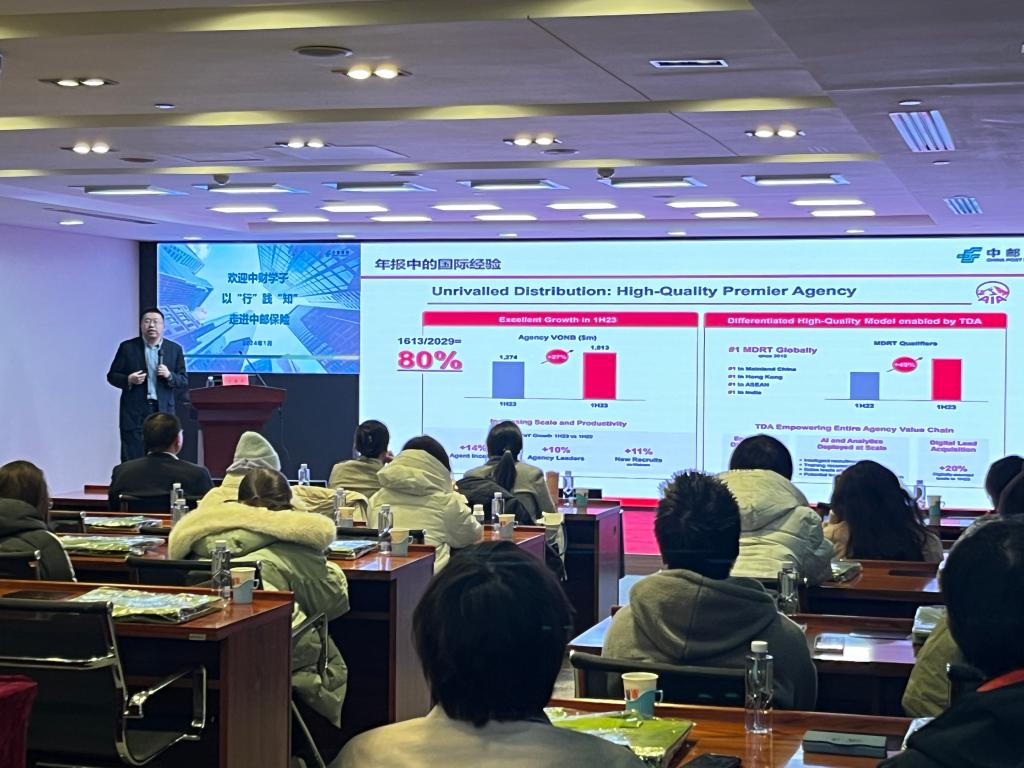 中邮人寿保险股份有限公司人力资源部副总宋礼红对于新葡萄8883官网AMG官网师生一行人的到来表示热烈的欢迎,对新葡萄8883官网AMG官网教学品质的卓越追求表示由衷的赞叹。他指出,中邮人寿保险股份有限公司真正做到了取信于民,守护了人民美好生活,以客户至上作为追求的价值。截止到2023年底,中邮保险总资产超4800亿,保费规模达1043亿,位居行业前列。此外,中邮保险人才培养模式具有双线并行的特点,以此更好地发挥人才引领作用,创建公平竞争平台,加强队伍建设,挖掘保险市场发展渠道,实现互惠共赢。