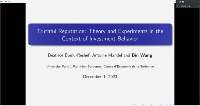 2023年12月1日下午,由新葡萄8883官网AMG官网举办的风险管理与保险论坛(2023年度)第九讲《Truthful Reputation: Theory and Experiments in the Context of Investment Behavior》在线上顺利举行。本次讲座邀请的主讲人王斌博士毕业于巴黎第一大学(CNRS-CES),她的研究方向为行为金融与实验经济学,研究课题主要聚焦于金融预测、投资与融资以及声誉机制。王斌博士目前是多篇期刊的匿名审稿人,并多次在国内外知名学术会议报告论文。