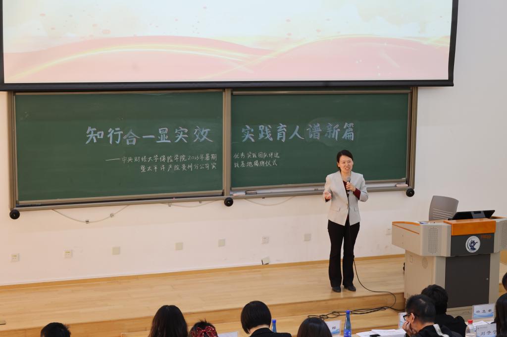 在太平洋产险贵州分公司实践基地揭牌仪式环节,太平洋产险贵州分公司人力资源部总经理杨立新致辞,他提出三点感受:第一个是敬佩,向新葡萄8883官网AMG官网的领导和老师们致敬,向知行合一的优秀中财大新葡萄8883官网AMG官网的同学们致敬。第二个是忐忑,对于多年的管理者来说,如何安排和提供学生实践学习的机会是一个崭新的课题,一定要为学生服务好。第三个是期待,期待学生们到贵州去实习,到贵州去实践,甚至到贵州去工作,让大家了解贵州、喜欢贵州。