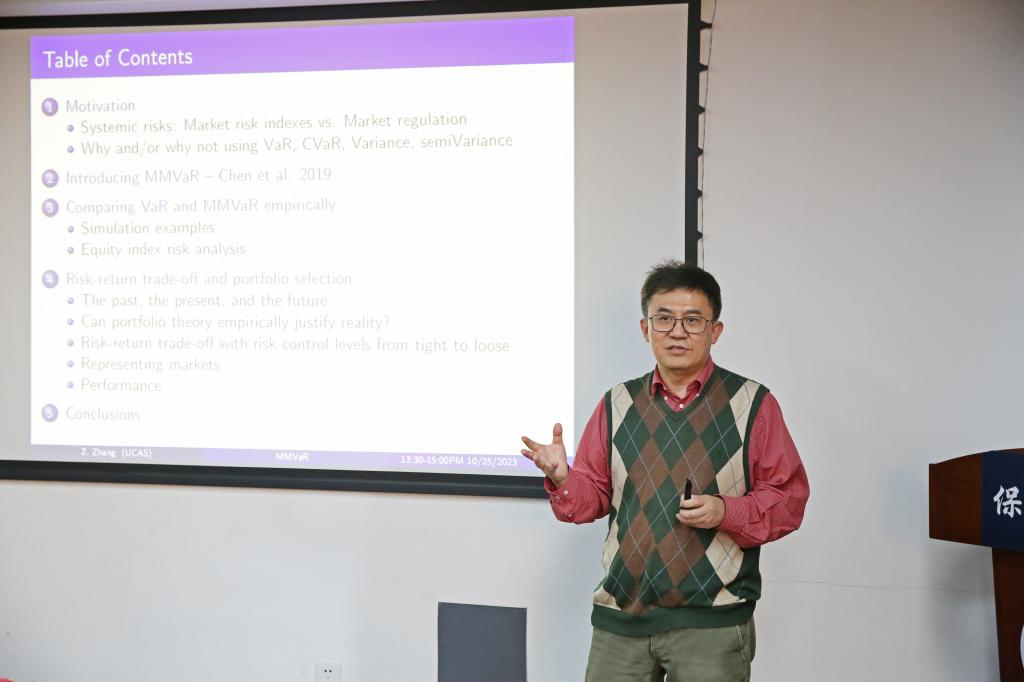 2023年10月25日下午,新葡萄8883官网AMG官网、中国精算研究院邀请来自中国科学院大学经济与管理学院的张正军教授做客学院第三期双周论坛,作了题为“Tail Risk Measures in Portfolio and Financial Investing: The Inadequate,The Specious, and The Balanced”的报告,并分享最新研究成果。张志军教授是中国科学院大学统计与数据科学系系主任,中国科学院预测科学研究中心副主任,原美国威斯康辛大学统计系终身教授和副系主任。本次双周论坛由副院长郑苏晋主持,学院教授和学生踊跃参加。