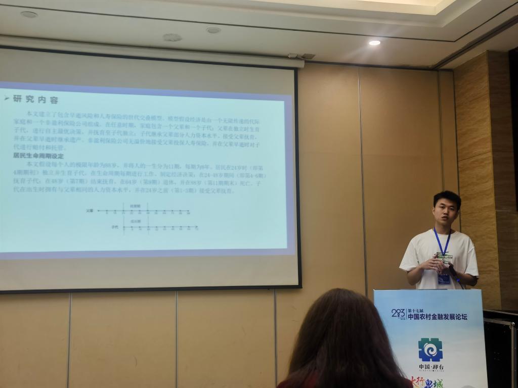 2023年8月11日至14日,2023年第17届中国农村金融发展论坛在邢台举办,新葡萄官网硕士研究生陈旭升与导师廖朴副教授合作的论文《人力资本代际转移视角下人寿保险防范贫困的作用研究》经评审后受邀参会。陈旭升同学参加了此次会议并在大会上做了学术报告。