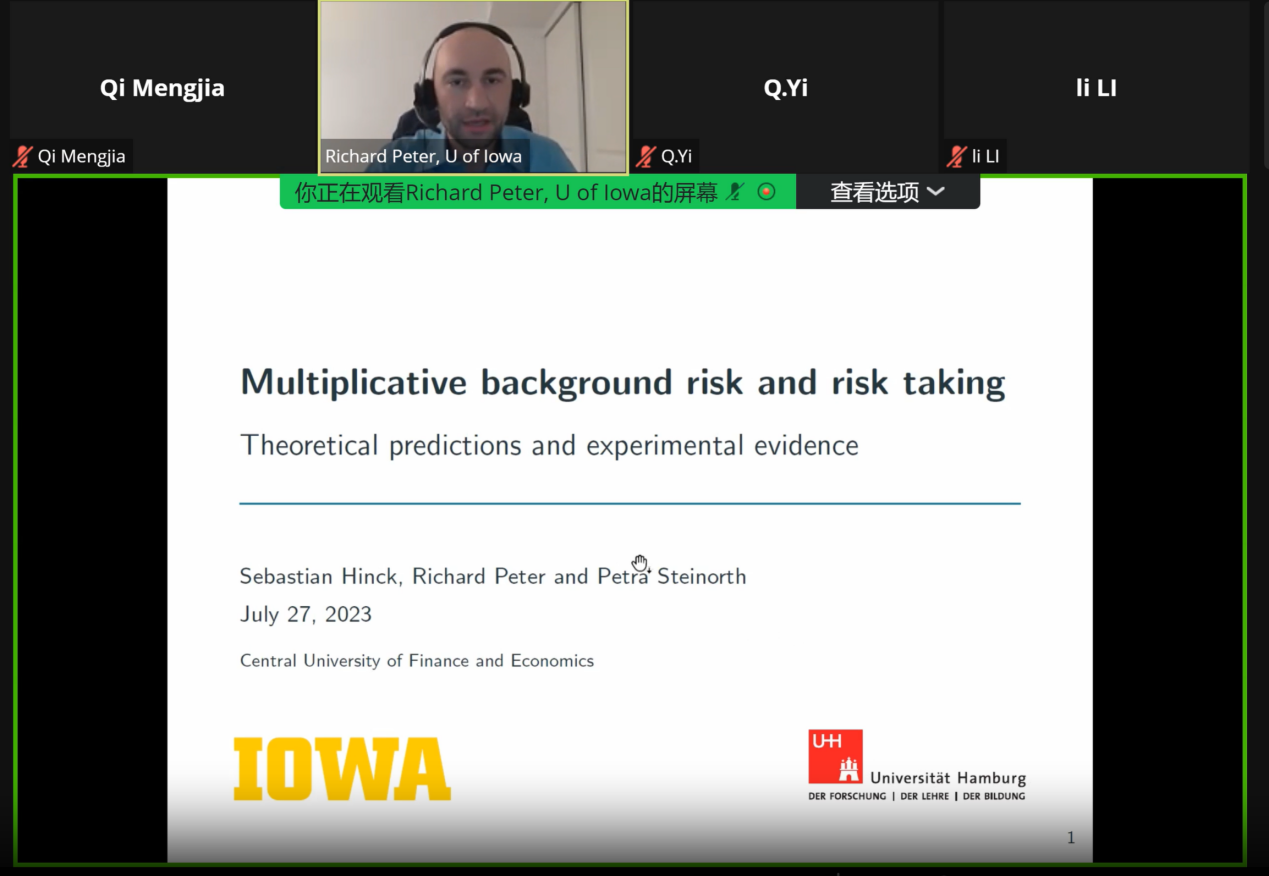 为活跃学院的学术氛围、促进国内外保险精算学术交流,应中国精算研究院池义春研究员邀请,美国爱荷华大学金融系的Richard Peter副教授于2023年7月27日中午通过zoom会议给新葡萄官网师生做了题为“Multiplicative background risk and risk taking”的精彩学术报告。