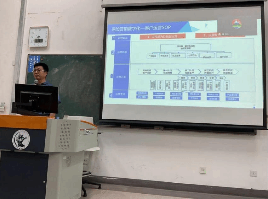 在课程的第二部分,孟冬冬先生讲解了保险营销的数字化之路。孟冬冬先生指出,保险市场已由“增量”转为“存量”,保险营销适应市场发展十分重要。保险营销模式需要完成从认知到认同再到认购的转变。孟冬冬先生还从获客、运营、客户运营评价等方面解释了保险营销数字化的各个环节。在课程的最后,孟冬冬先生与同学们讨论了ChatGPT对未来职业造成的冲击,并希望同学们能够成为复合型人才。