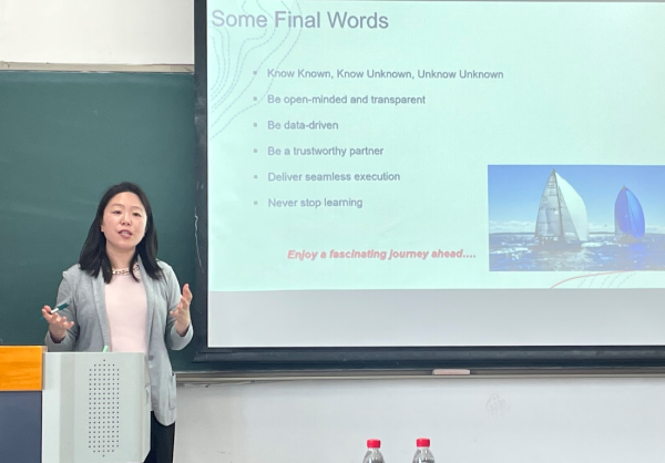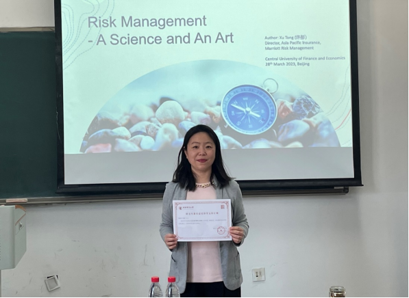 2023年3月28日,新葡萄8883官网AMG官网研究生精算认证课程《资产负债管理Ⅱ》的课堂上,许彤女士受邀为同学们授课,授课主题为大型企业的风险管理与实践。许彤女士现任万豪国际集团风险管理部亚太区保险总监,毕业于南开大学,北京大学,比利时Vlerick商学院,负责集团亚太区26个国家和地区酒店的保险事务。从业20余年,曾供职韦莱(中国),负责财产保险与能源保险,在北京、上海和新加坡工作,拥有丰富的风险管理工作经验。