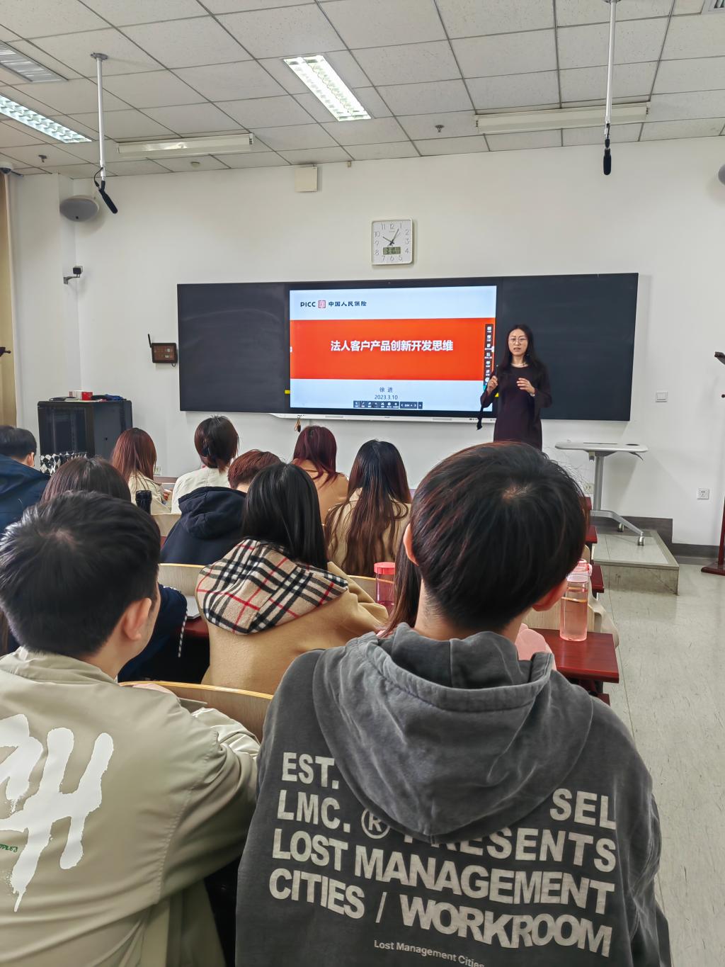 本次讲座,徐女士结合自身20年的从业经验,详尽介绍了法人客户创新产品体系和开发过程,阐释了保险公司、政府、第三方在法人客户产品中的不同角色以及前沿保险的社会职能,内容丰富,深入浅出,极大地帮助了同学们全面了解掌握法人客户产品创新开发思维。现场气氛活跃,大家积极讨论,讲座在热烈的掌声中拉下帷幕。