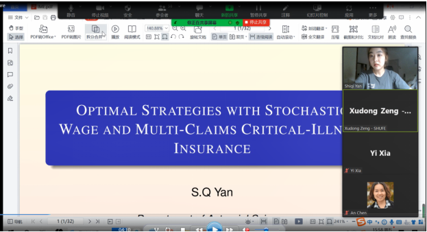闫诗琪报告了其与导师刘敬真副教授撰写的论文《Optimal Strategies With Stochastic Wage And Multi-Claims Critical-Illness Insurance》。她研究了具有随机收入现金流的家庭在确定时间段内的最优投资、消费和重疾险购买决策问题,创新地在家庭资产配置中引入了可以多重赔付的重疾险,在CARA效用函数的形式下,得到了该最优化问题的显式解。