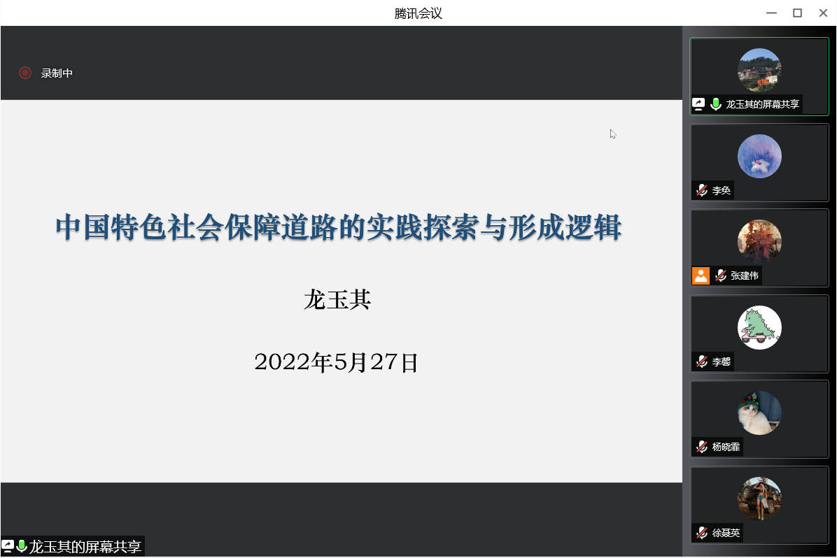 2022年5月27日下午,“中国特色社会保障道路的实践探索与形成逻辑”讲座在腾讯会议平台顺利举行。本次讲座邀请到了首都师范大学管理学院副院长龙玉其副教授作为主讲嘉宾,由新葡萄8883官网AMG官网劳动与社会保障系系主任张建伟副教授主持。校内外师生40余人参加了讲座。