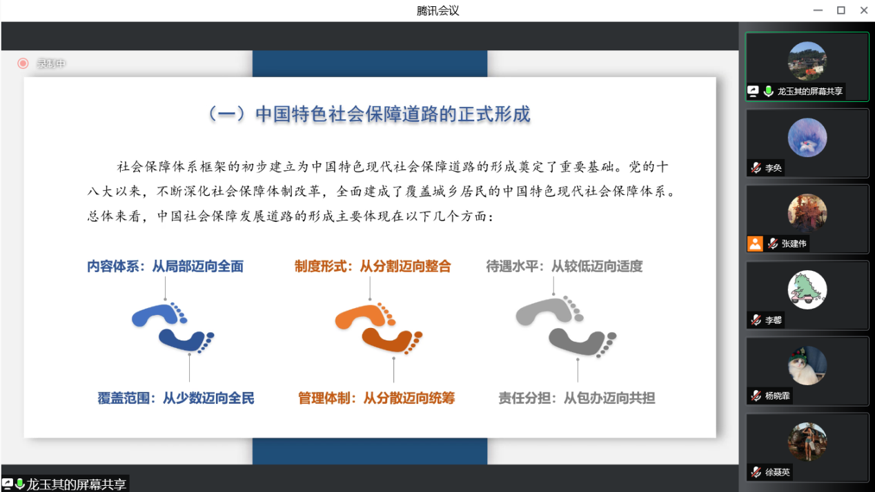 然后,龙玉其副教授详细介绍了中国特色社会保障道路的正式形成及其内涵。龙玉其副教授指出,党的十八大以来,中国特色社会保障道路的形成主要体现在以下几个方面:一是保障内容从局部迈向全面,二是覆盖范围从少数迈向全民,三是制度形式从分割迈向整合,四是管理体制从分散迈向统筹,五是待遇水平从较低迈向适度,六是责任分担从包办迈向共担。接着,龙教授讲解了新时代中国特色社会保障道路的基本内涵:一是保障模式的综合性,二是适应人群差异的制度多元化,三是重视发挥集体、社区在社会保障中的作用,四是强调社会成员的互助共济与扶危济困,五是注重社会保障的协调性,六是强调发挥家庭保障的基础性作用。
