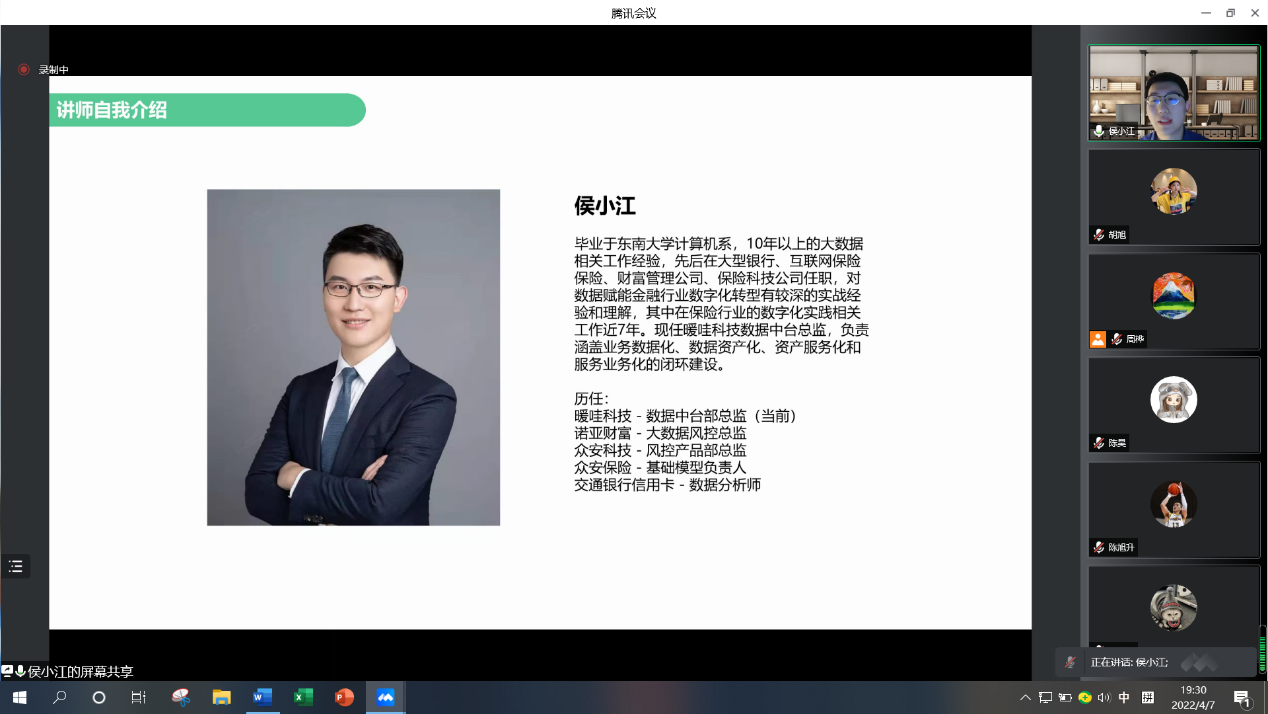 4月7日,第六次的《保险科技》课程由暖哇科技总经监侯小江先生主讲。侯小江先生总毕业于东南大学计算机系,先后在大型银行、互联网保险公司、财富管理公司、保险科技公司任职,对数据赋能金融行业数字化转型有丰富的实战经验和深刻理解,其在保险行业的数字化实践相关工作近7年,并具备10年以上的大数据相关工作经验。侯小江先生现任暖哇科技数据中台总监,负责涵盖业务数据化、数据资产化、资产服务化和服务业务化的闭环建设。