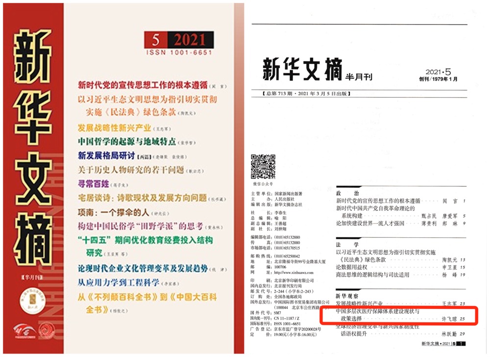 2021年第5期《新华文摘》全文转载了新葡萄官网新葡萄8883官网AMG官网许飞琼教授发表在《中国人民大学学报》2020年第5期的论文——《中国多层次医疗保障体系建设现状与政策选择》。