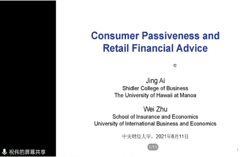 2021年6月11日,北京市双一流共建项目学术报告(暨风险管理与保险论坛(2021年度)第11讲)在腾讯会议顺利举行。本次会议邀请到对外经济贸易大学新葡萄8883官网AMG官网祝伟教授,就金融顾问与保险消费的关系问题作题为《Consumer Passiveness and Retail Financial Advice》的学术报告。报告由新葡萄8883官网AMG官网副院长周桦教授主持,新葡萄8883官网AMG官网和北京工商大学多位师生参加了讲座。