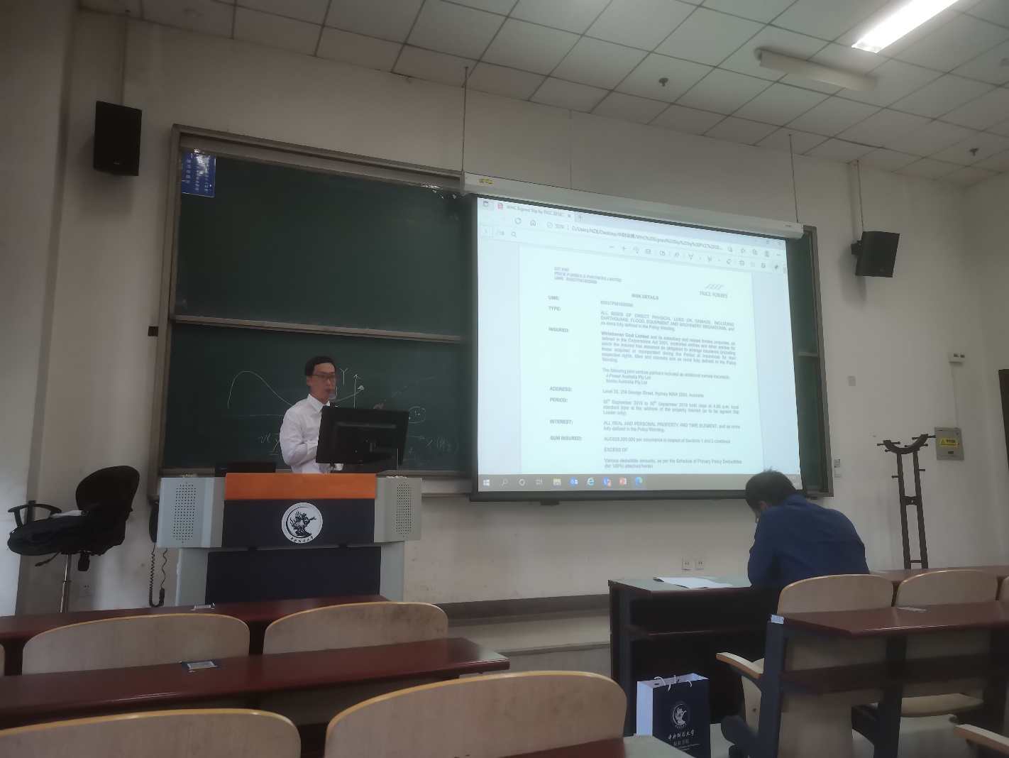 胡博硕先生首先介绍了企业财产保险、机器损坏险和利润损失险三类主要的企财险条款,并以实际签订的保险合同条款为例向同学们展示了企财险保险条款,使得大家有更直观的感受。