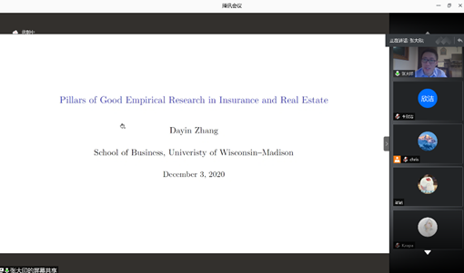 2020年12月4日上午,威斯康辛大学麦迪逊分校房地产系张大印助理教授应新葡萄官网陈华副教授邀请,做客保险经济学第六期讲座,以“Pillars ofGood Empirical Research in Insurance and Real Estate”为主题进行了一场线上讲座,讲座由新葡萄官网陈华副教授主持。