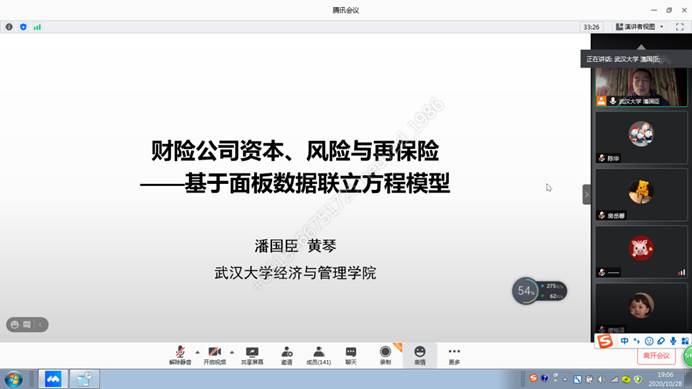 2020年10月28日,武汉大学经济管理学院潘国臣副教授应新葡萄官网陈华副教授邀请,做客保险经济学第一期讲座,以“财险公司资本、风险与再保险——基于面板数据联立方程模型”为主题进行了一场线上讲座。讲座由新葡萄官网陈华副教授主持,学院老师、博士生、硕士生、本科生以及北京工商大学关晶老师等其他院校师生近150人参加了讲座。