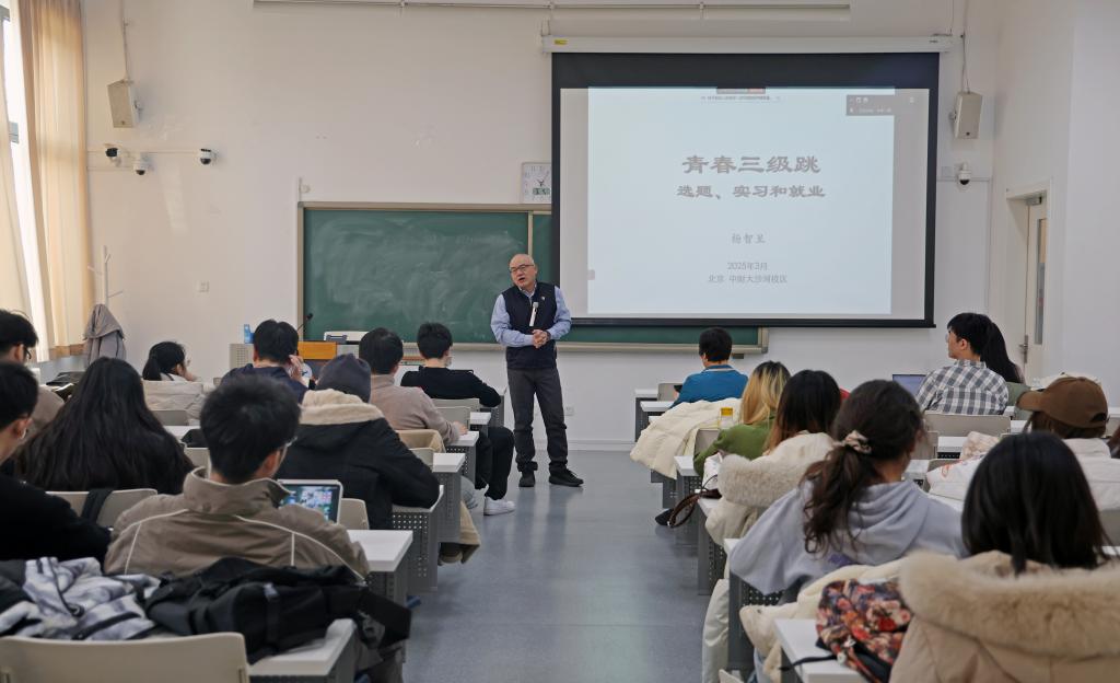 杨智呈先生以“认时势者为俊杰”开篇,强调青年学子需认清时代特征,紧扣时代脉搏,关注行业趋势,打开思路,研究行业新问题,把握新机遇。他指出,同学们应充分利用校内外导师等资源,认清国家、行业和专业形势变化,从而顺利走好从“校门”迈向社会的关键之路,完美实现“青春三级跳”。