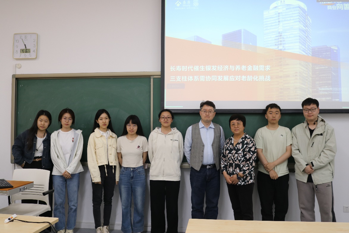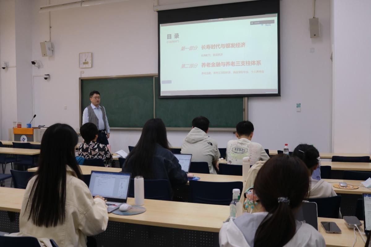 刘方涛指出,养老金融是为应对老龄化挑战,围绕社会成员的各种养老需求所进行的金融活动的总和,包括养老金金融、养老服务金融、养老产业金融三部分,国家高度重视保险在养老金融中扮演的角色。他采用丰富的数据为师生分析了每类养老金融的内涵、政策支持、市场现状、制度设计和发展路径。