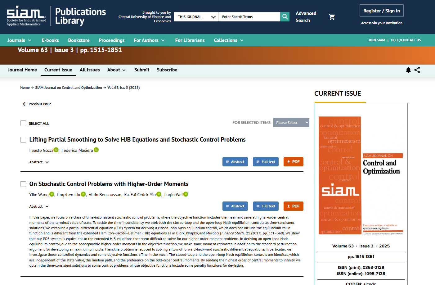 新葡萄官网刘敬真教授近日在运筹类权威期刊(新葡萄官网AAA类期刊)SIAM Journal on Control and Optimization发表论文“ON STOCHASTIC CONTROL PROBLEMS WITH HIGHER-ORDER MOMENTS”。该论文合作者包括新葡萄官网博士毕业生王奕可博士,香港理工大学Ka-Fai Cedeic Yiu教授,德克萨斯大学达拉斯分校Alain Bensoussan教授以及华东师范大学危佳钦教授。