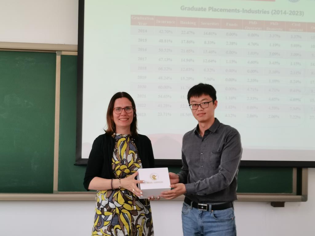 短期课程结束后,新葡萄8883官网AMG官网、中国精算研究院副院长郑苏晋教授、风险管理与保险系系主任马冰副教授分别向Mierau教授和Angelini教授赠送了学院的文创产品。