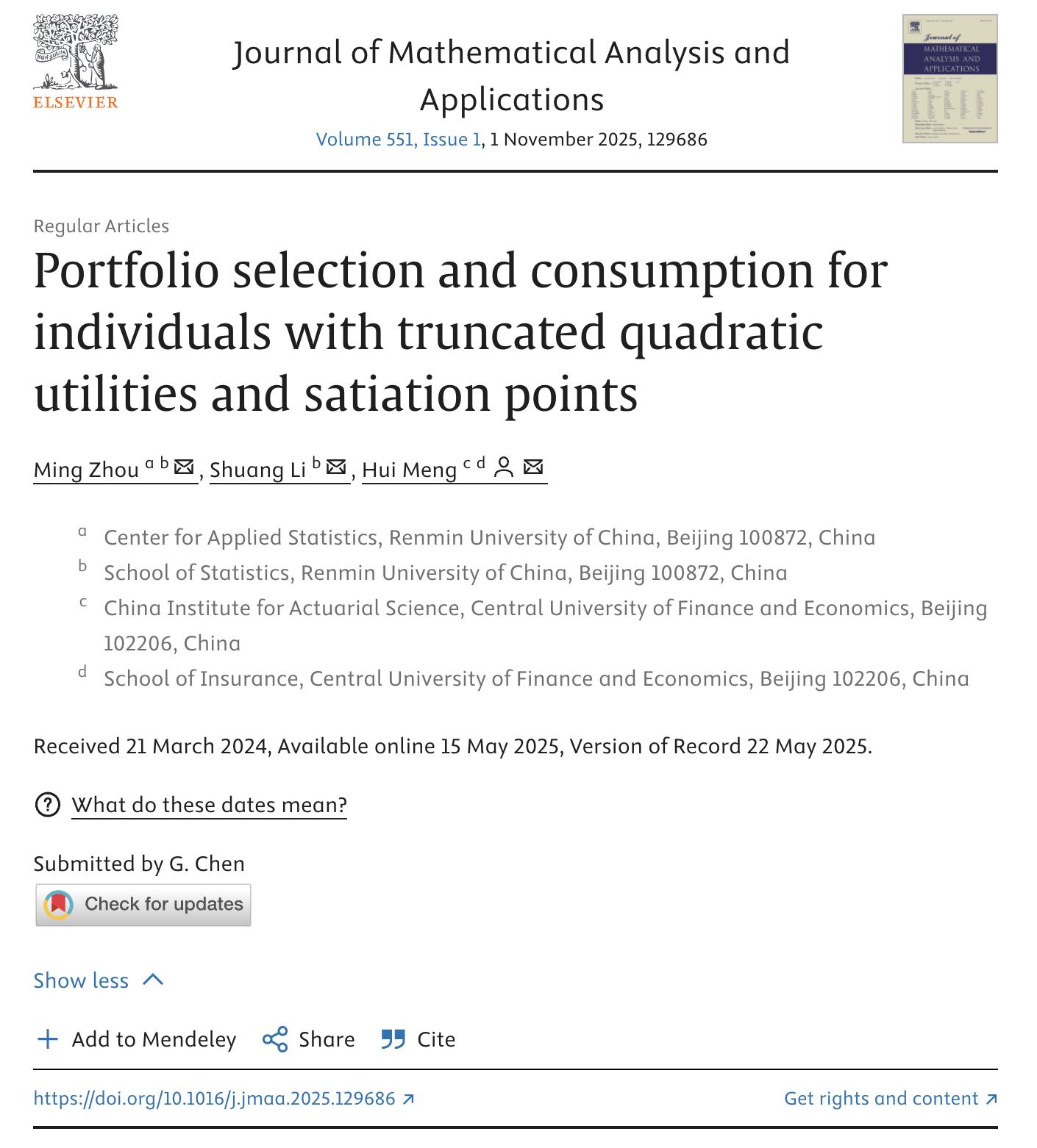 新葡萄官网孟辉教授近日与中国人民大学周明教授及博士生李爽在新葡萄官网AA类重要期刊Journal of Mathematical Analysis and Applications发表论文,题目为“Portfolio selection and consumption for individuals with truncated quadratic utilities and satiation points”。