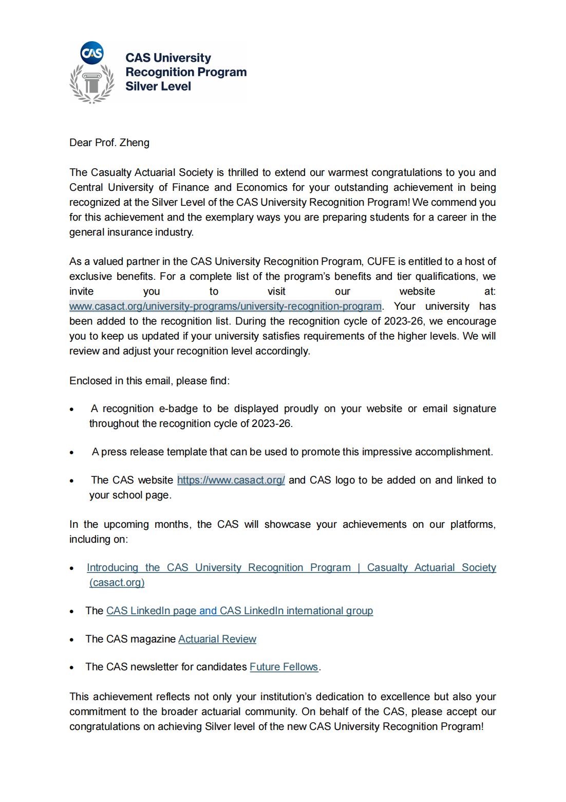2024年3月14日,北美产险精算师协会(Casualty Actuarial Society,CAS)致函新葡萄官网,确认新葡萄8883官网AMG官网精算项目已通过其高校认证项目(University Recognition Program)的严格审核,并荣获“Silver Partner”认证。这一荣誉标志着新葡萄官网成为中国大陆首批获此殊荣的高校,彰显了新葡萄官网在精算教育领域的卓越实力。