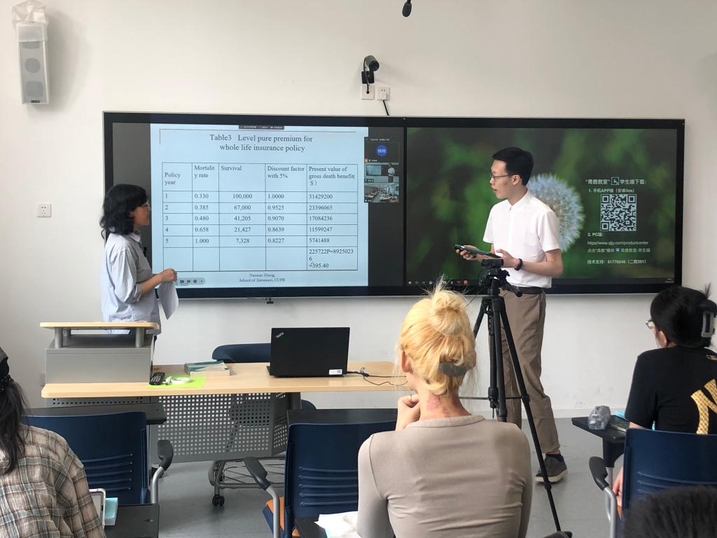 课前双方授课教师确定授课内容为“Life Insurance Policies”,并就授课方式以及“线上+线下”联合授课形式进行了充分沟通。在课堂上,张楠楠老师用全英文讲授了人寿保险的概念和职能、人寿保险的创新、人寿保险需求以及保险产品条款等内容。乔杨老师负责北京工商大学课堂的针对性辅导和互动讨论,两位教师分工明确,优势互补、密切合作,真正做到现场和远程的完美结合。两校学生在课上均积极回答问题,全身心参与课堂互动,他们对授课效果进行了充分的肯定。